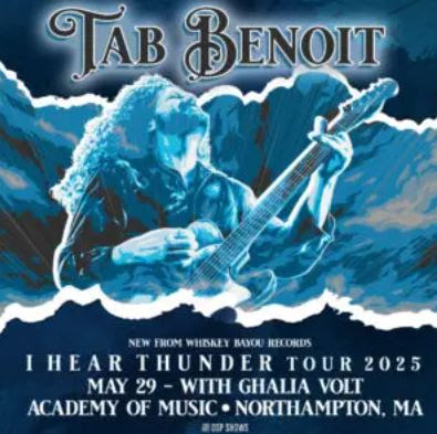 ![]() Tab Benoit’s 2025 Year-Long “I Hear Thunder” Rumbles Into The Academy of Music In Northampton Thu May 29 “Benoit is at the top of his game with I Hear Thunder. It delivers the big tone he’s known for as Tab walks the razor’s edge in a set that deals with heartbreak and joy” – CHICAGO BLUES GUIDE |